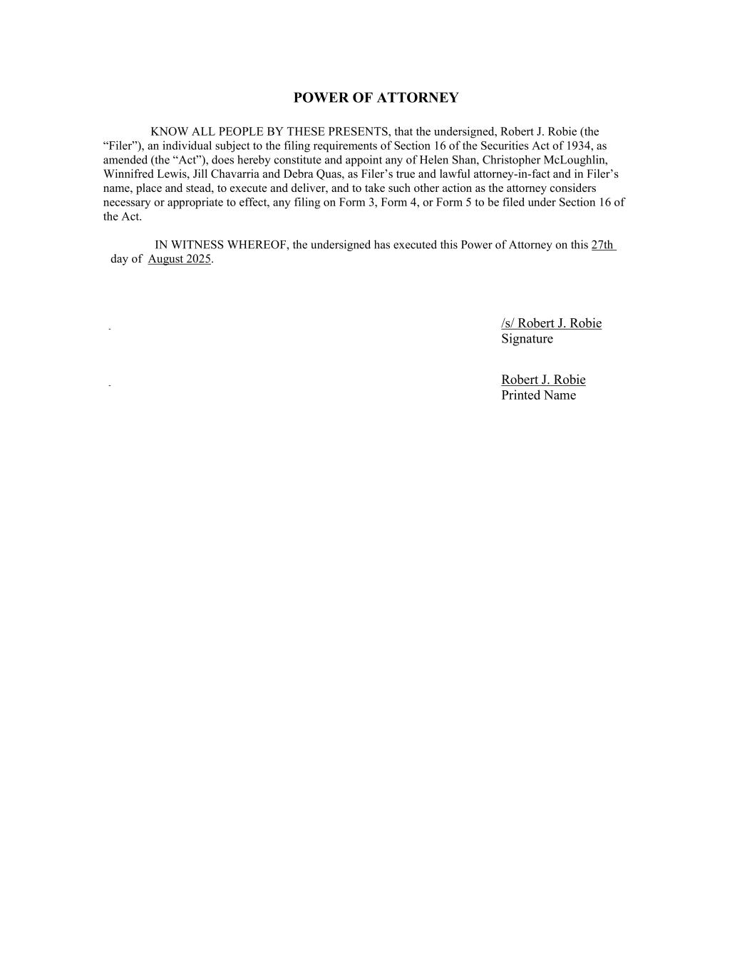 | /s/ WINNIFRED LEWIS, Attorney in Fact for Robert J. Robie | 09/17/2025 | |